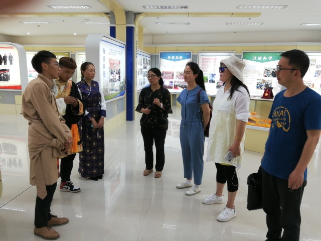 西藏学生对故乡来的贵宾表示热烈欢迎,并献上哈达;吴龙副校长与全体学员和学生合影;学员们随后参观了校史展览馆和古籍室。