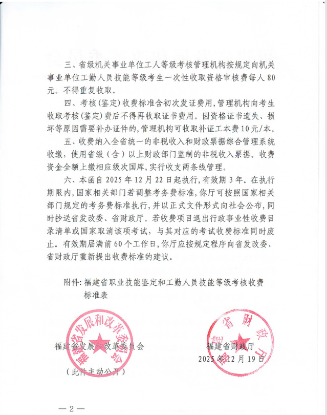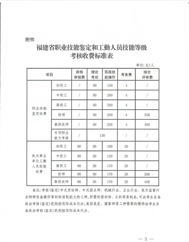 福建省发展和改革委员会 福建省财政厅关于我省职业技能鉴定和机关事业单位工勤人员技能等级考核收费标准等有关事项的函